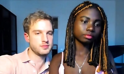 Hot slim ebony nubile babe takes white cock in both holes live